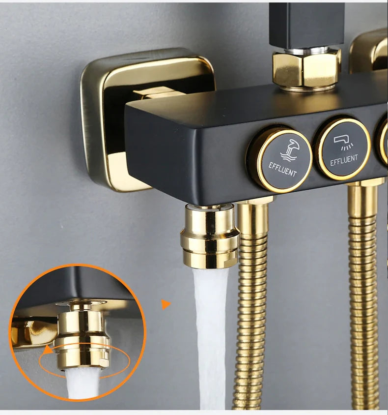 Златни и черни смесители за душ в модерно пространство за баня.