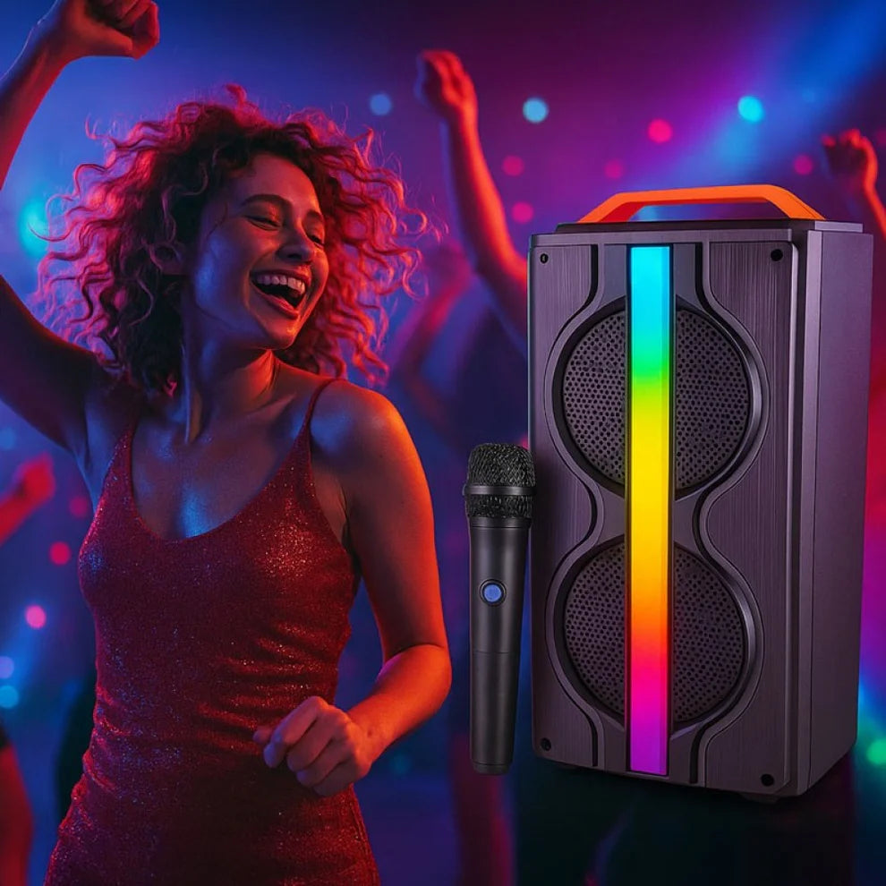 LED RGB осветлението създава ефектна атмосфера, а компактният и удароустойчив корпус прави колоната удобна за пренасяне навсякъде.