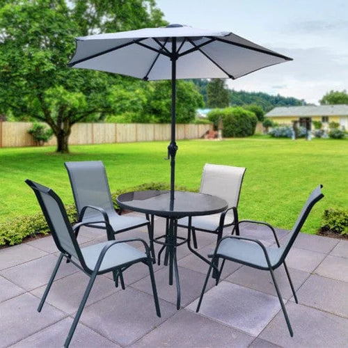 Комплект градински мебели в 5 части – 4 броя столове и 1 брой маса. Градинските мебели са произведени с метална тръбна конструкция в сив цвят. Масата e с темперирано стъкло и с отвор за градински чадър. Седалките и облегалките на столовете са от текстилен, който представлява висококачествен материал с PVC покритие за максимална устойчивост и здравина.