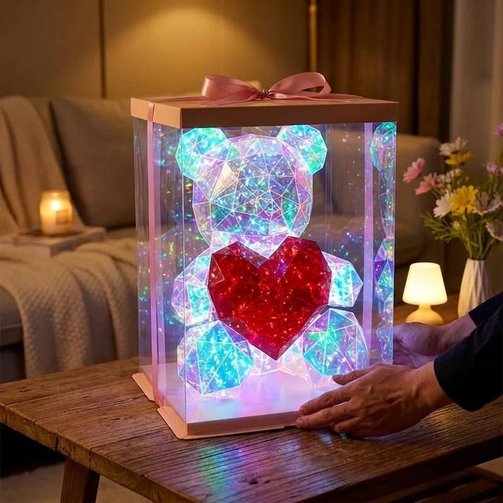 Нежна и сладка декорация за всеки дом. Това малко мече със сърце, което свети, е перфектният начин да внесете малко магия в ежедневието си. Подходящо за подарък или за декорация на детска стая. Работи на батерии/USB кабел и е лесен за поставяне на рафт, бюро или нощно шкафче.