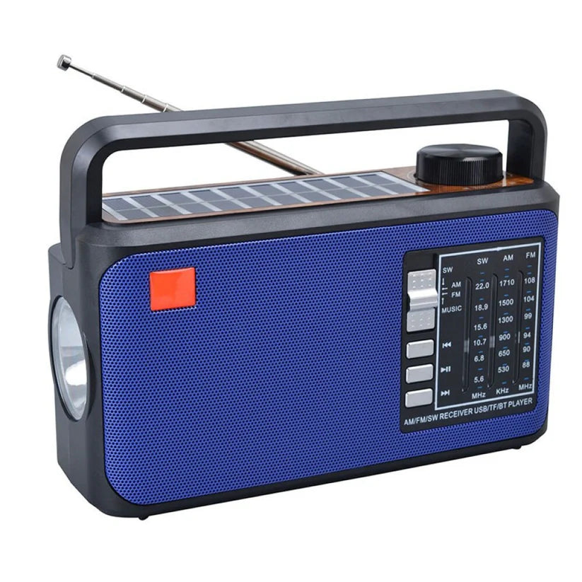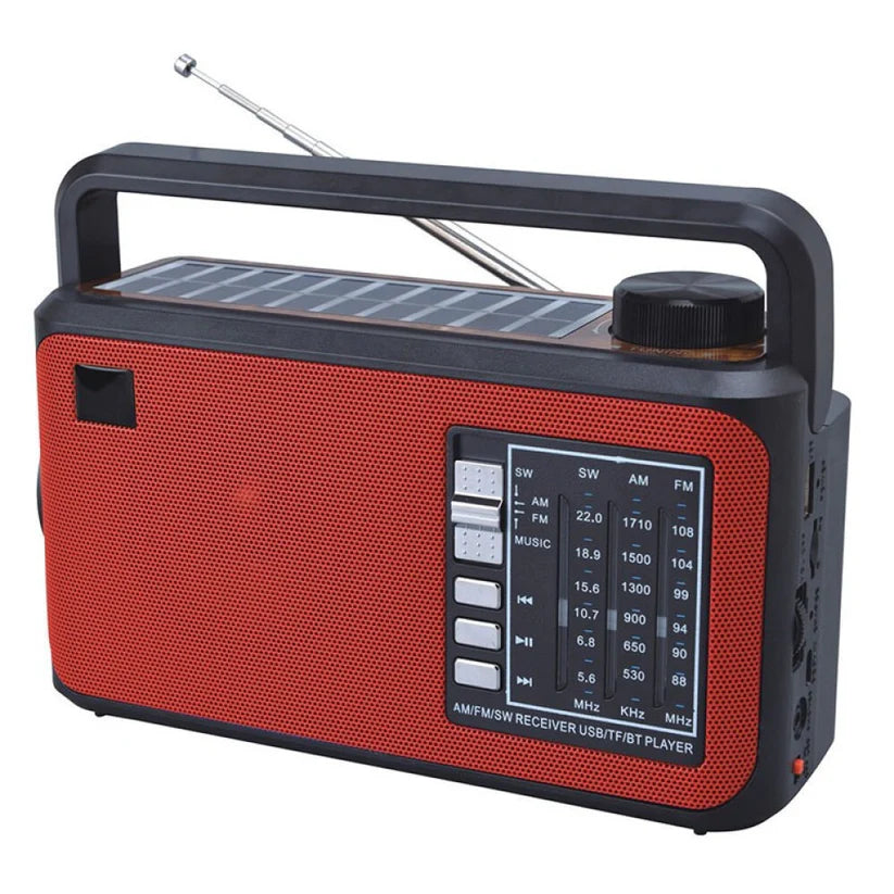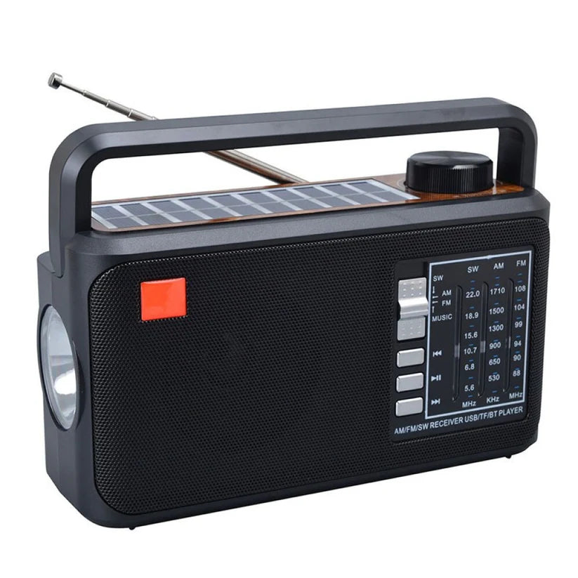 Компактно и функционално радио, което съчетава класически дизайн с модерни технологии. Поддържа AM/FM/SW обхвати, Bluetooth свързаност, USB и TF слот за музика, има вградена литиева батерия и може да се зарежда чрез соларен панел или мрежово захранване. Идеално за пътуване, къмпинг, риболов или у дома.