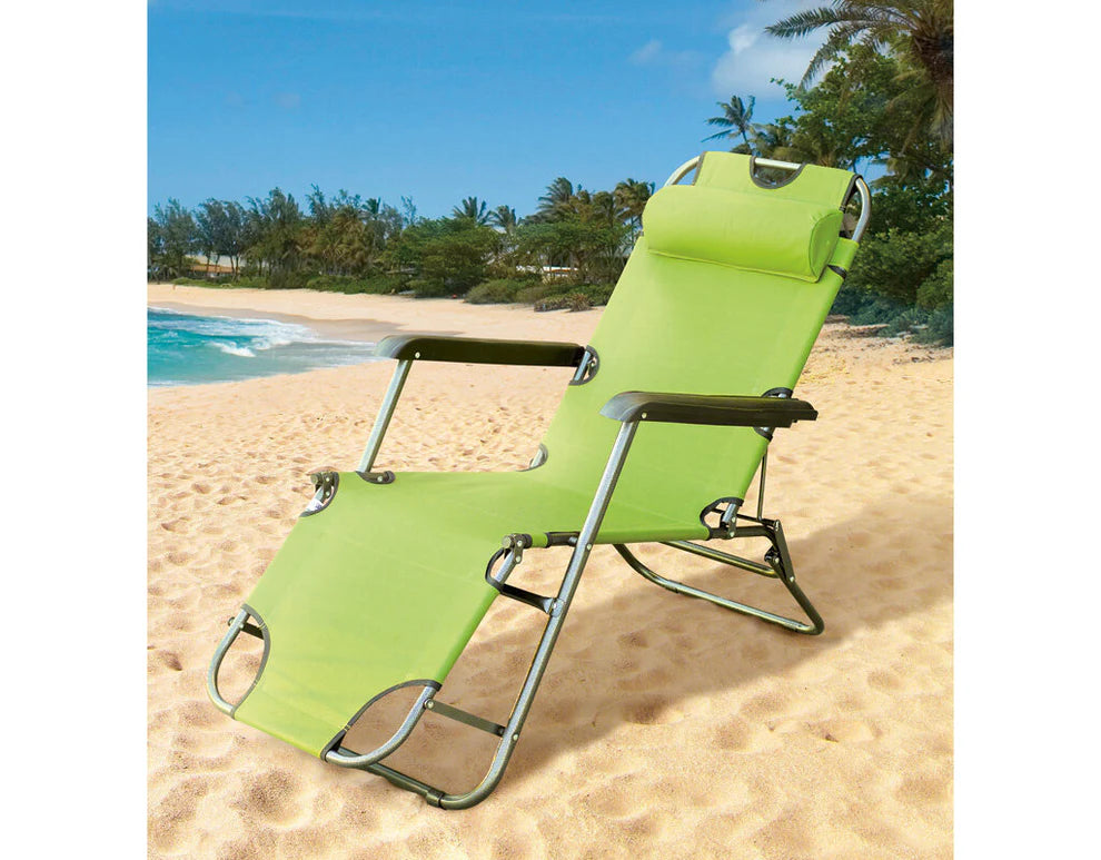 Сгъваем комфортен шезлонг, идеален за градина, балкон, плаж или къмпинг.
