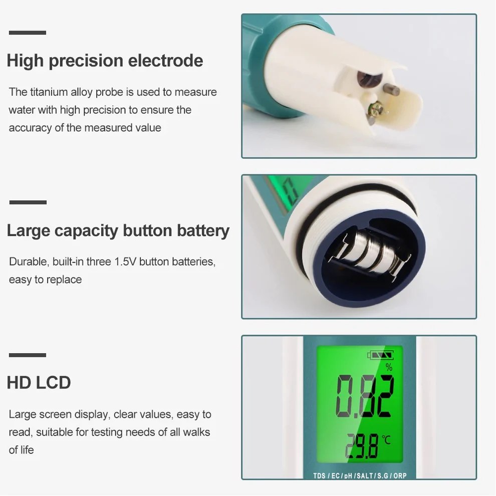 Тестер за качество на водата 7в1, pH, TDS, EC, S.G., ORP, Температура, Соленост